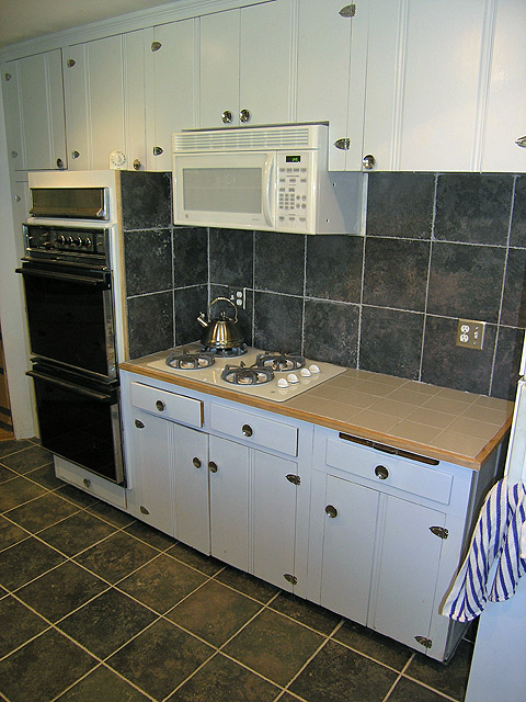 Kim's dad Rob generously replaced our old cooktop with a slick GE glass-face model. He also installed a microwave oven, with vent fan and light, to replace the greasy old vent hood.