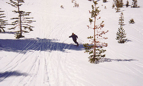 Kim races down through the trees on our backcountry trip to the east bowl of Mt. Tallac.