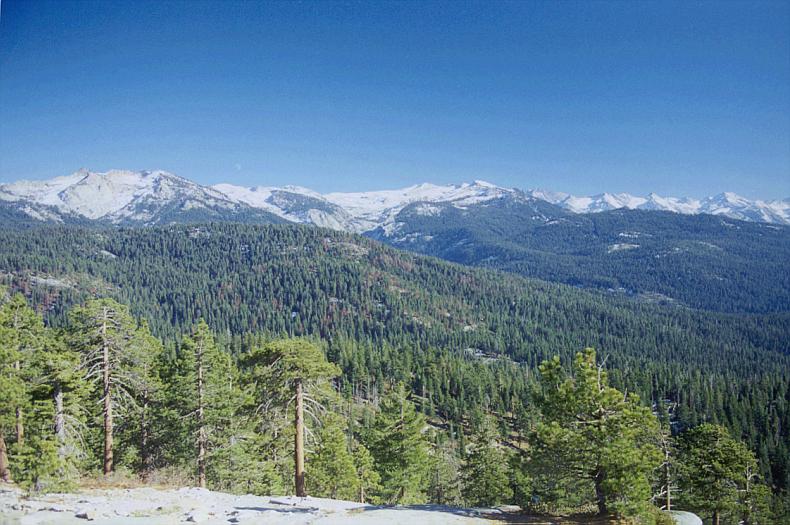 Lodgepole is roughly in the center, hidden by a hill in the foreground. Alta Peak is center-right. I believe the big peaks on the right are from the Great Western Divide. Mt Silliman is probably the reddish one on the left.