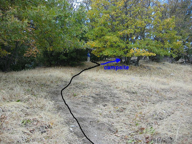 | After taking a left turn at the trail fork on Devils Peak summit (marked with cairn), the path to Mount Carmel is a bit hidden in the brush. The most well-beaten track (marked "campsite") dead-ends. The light track to Mount Carmel is on the left, where Kim is standing. |