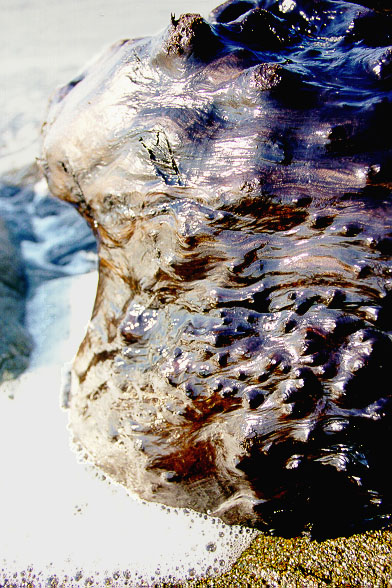 A worn piece of driftwood on the beach.
