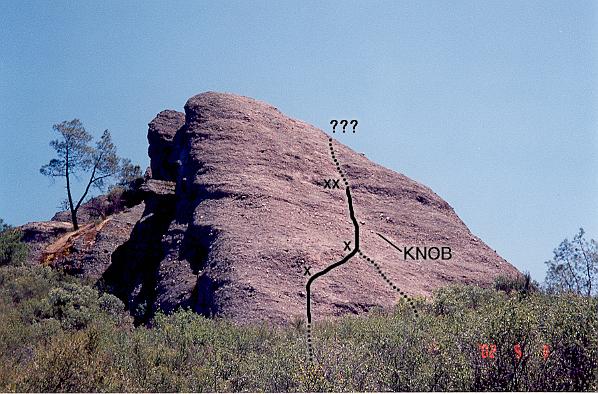 There is some confusion about bolt placement on this route. Rubine's guidebook shows two bolts above the second, and a two-bolt anchor on top. However, I saw nothing between the second bolt and a new, intermediate belay station, except for a rusted, bare bolt. While the climbing is easy, the runout is pretty serious, and the belayer's view of the climber is blocked for much of the route. I was able to get a pretty good sling around a knob (shown on picture), but I wouldn't trust my life on it. When I led, I tied off to the intermediate anchor. As I could not see any bolts above me, or an anchor at the top, I did not climb to the top. |