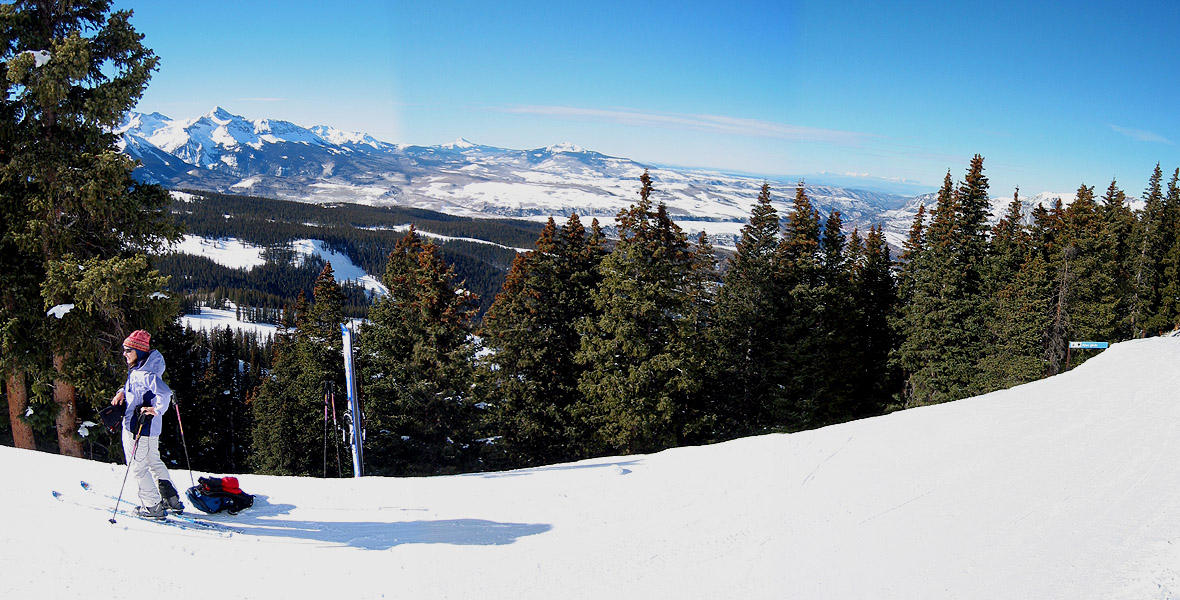 Panoramic photo from high above Telluride resort, Colorado, December 21, 2003. Looking down toward Mountain Village.