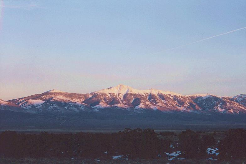 | Wheeler Peak (13,000'+) at sunset, from a range of 10-15 miles. This is the highest peak in GBNP, and I believe the second highest in the state of Nevada. In addition to forests of Bristlecone Pine trees, Wheeler Peak has a large glacial cirque on its northern slopes. Although no glacier lies in the cirque today, the 2000' headwall and moraines leave no doubt. I believe this was the only glacier in all of Nevada. |