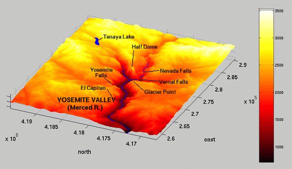 I use a Linux workstation, so my options, short of writing my own conversion software with SDTS++, are more limited. Click here and I'll take you through my data processing flow. After I get the data into a processible state, any 2-D image processing techniques are fair game. As you can see below, I've made "steepness maps" by a simple gradient magnitude computation. I've also tried to solve the "traveling hiker problem" ( explanation | examples ): given a series of fixed points, determine the optimal path passing through all the fixed points, i.e., the path that minimizes the amount of work done by the hiker. My approach is crude, so please poke fun at me if I deserve it, or better yet, give me your solution!