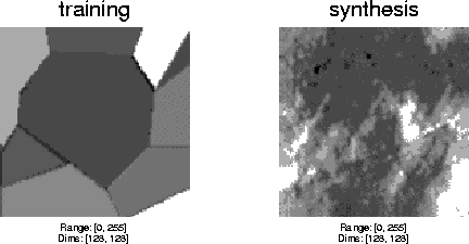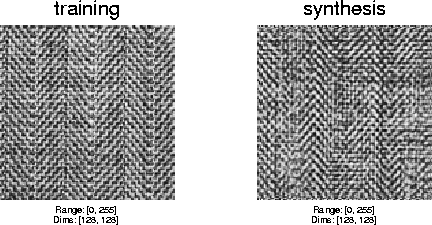 Figure 5 This image is simply parameterized in terms of two-point statistics, which our algorithm uses, hence the excellent synthesis of the herringbone fabric image. This result effectively maintains the vertical homogeneity property of the TI. | ![]() |