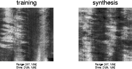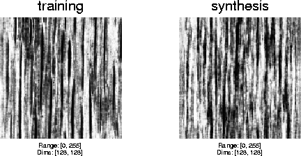 Figure 3 This method does a marvelous job of synthesizing the sepele bark image. Though it obviously has features with different characteristic size, the image is roughly stationary upon inspection, and its spatial features are not sharply localized in space, and is thus quite easy to synthesize. | ![]() |