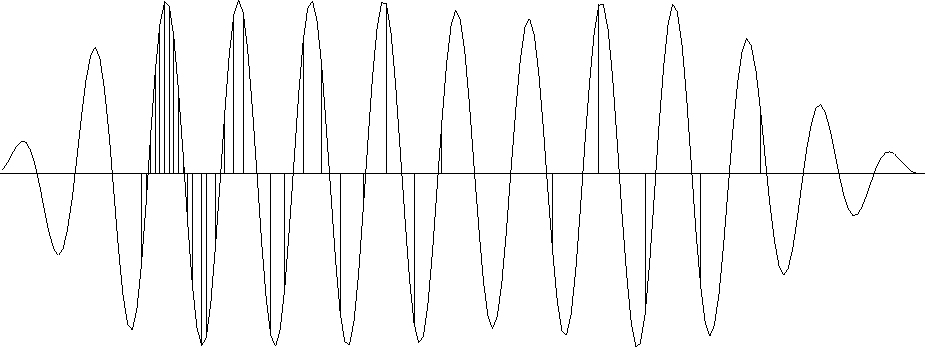 Figure 26 Interpolating with a three-term filter. The interpolated signal is fairly monofrequency. | ![]() |
