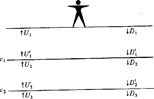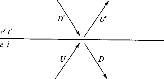 The reflection and transmission coefficients show one how to calculate the waves resulting from a wave impinging on a layer. Equation (11) relates to Figure 5 and shows how from the waves U an D' one extrapolates into the future to get U' and D.