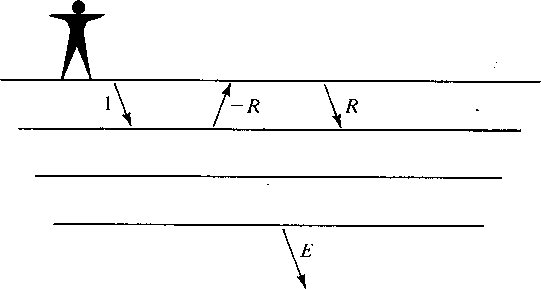 Figure 7 Basic reflection seismology geometry. The person initiates an impulse going downward. The earth sends back -R(Z) to the surface. Since the surface is perfectly reflective, the surface sends R(Z) back into the earth. Escaping from the bottom of the layers is a wave E(Z) which is heading toward the other side of the earth. | ![]() |