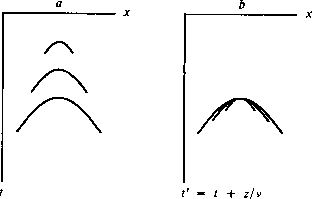 Mainly what happens in the movie is that the event migrates upward toward t=0. To remove this dominating effect of vertical translation make another superposition, keeping the hyperbola tops all in the same place. Mathematically, the time t axis is replaced by a so-called retarded time axis t ' = t + z/v, shown in Figure 5b. The second, more precise definition of migration is the motion of an event in ( x , t ' )-space as z changes. After removing the vertical shift, the residual motion is mainly a shape change. By this definition, hyperbola tops, or horizontal layers, do not migrate.