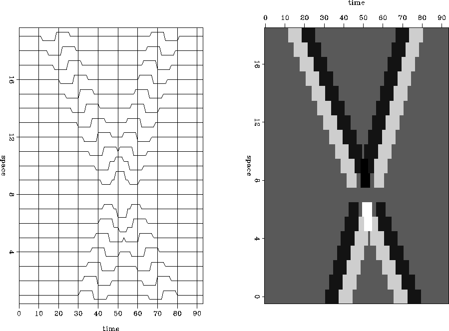 Figure 4 Crossing plane waves superposing viewed on the left as ``wiggle traces'' and on the right as ``raster.'' | ![]() |