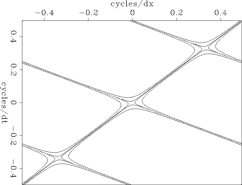 Let us examine the Fourier domain for this filter. The filter (10) was transformed to the Fourier domain; it was multiplied by its conjugate; the square root was taken; and contours are plotted at near-zero magnitudes in Figure 18. The slanting straight lines have slopes at the two dips that are destroyed by the filters. Noticing the broad lows where the null lines cross, we might expect to see energy at this temporal and spatial frequency, but I have not noticed any.