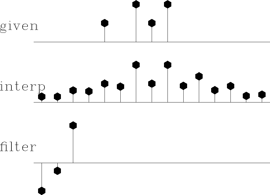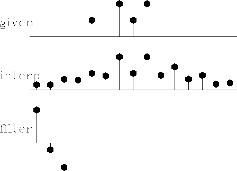 Figure 8 Top is known data. Middle includes the interpolated values. Bottom is the filter with the leftmost point constrained to be unity and other points chosen to minimize output power. | ![]() |