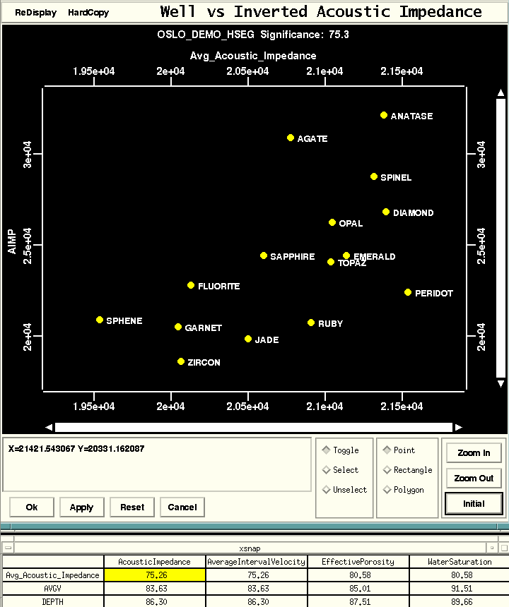 A cross plot of the acoustic impedance estimated from surface seismic