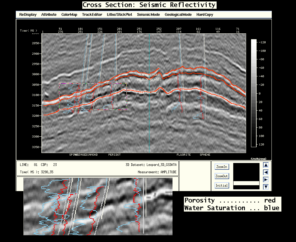 note the similarity between the impedance log to both the porosity log and the impedance well trace (right track). This is significant as the acoustic impedance well trace was generated WITHOUT well data.