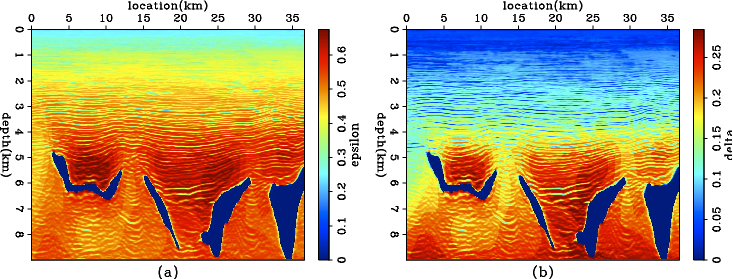 - Anisotropic model building using surface seismic data is a well-known under-determined and nonlinear problem. Inversion lost direction in the null space and ended up with ambiguous models. Albert Tarantola taught us that adding a model covariance can regularize the inversion. However, how to build a covariance matrix remains a mystery. In the current studies, we build the anisotropic prior model using deterministic and stochastic rock physics modeling for shale anisotropy. An ensemble of rock physics models are generated by sample the input parameters in a certain region, which can be significantly narrowed down using well log measurements. The lithological inversion results of a previous seismic processing workflow can also be used as the input of the rock physics modeling.